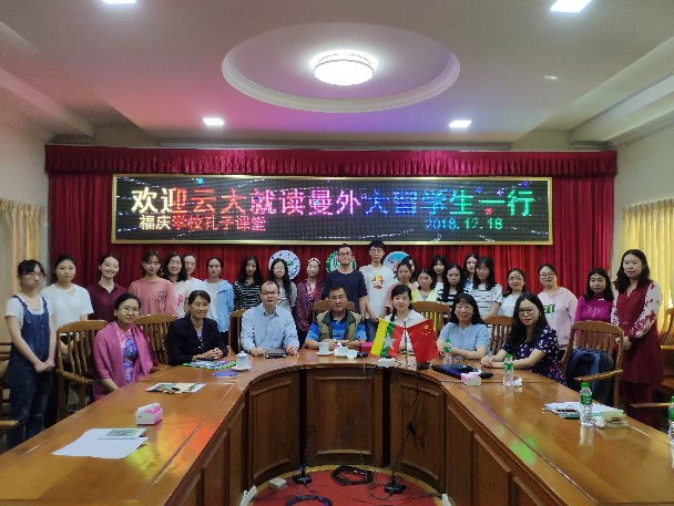 第二天,何淼淼副书记一行率领同学们到访曼德勒福庆学校孔子课堂。福庆学校校长李祖清教授、孔子课堂中方主任李涛副教授对我们的到来表示热烈欢迎。在座谈会上,李涛老师激励在缅留学的同学们要努力学习,尽快适应缅甸生活,学以致用,并鼓励大家到教学点做志愿者,增加自己的社会实践经验。随后,何淼淼副书记也介绍了白菜官网留学生情况,对在缅学习的同学们提出了新的要求和期望,并希望进一步加强白菜官网与与福庆孔子课堂的合作。最后,福庆学校校长李祖清教授表示,今后将为在缅学习的云大留学生们专门开设缅甸文化讲座课程,提供更加优质的志愿服务岗位和学习资源。