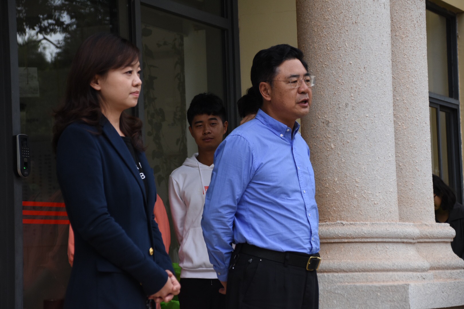9月3日上午,600cc全讯白菜自助注册党委书记彭荣、院党委副书记何淼淼、院党委办公室主任谭心老师、学工办主任龙莹老师和2019级辅导员邬永嘉老师,在600cc全讯白菜自助注册行政楼前为2019级军训新生和军训教官带去慰问。