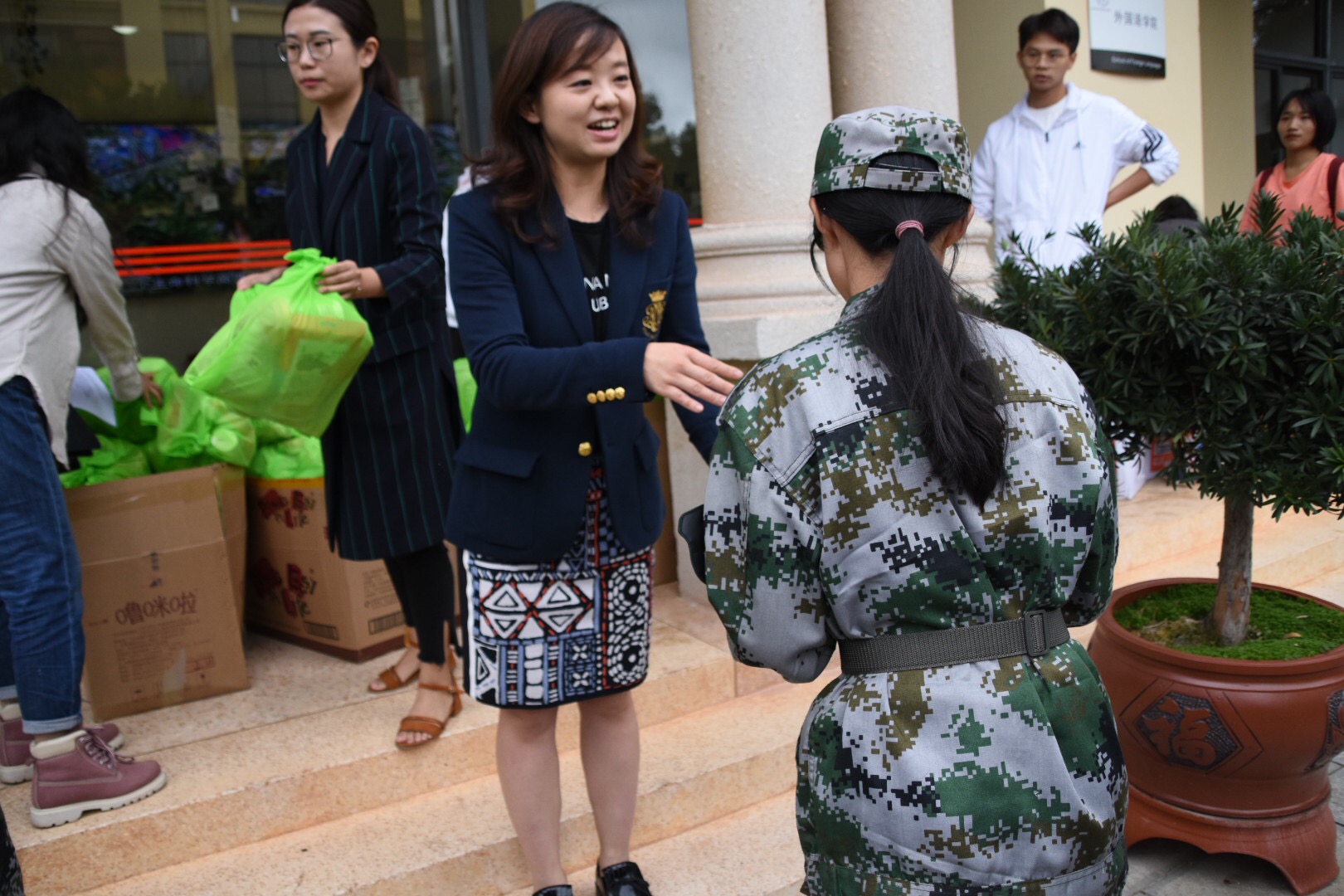 慰问结束时,学院领导和老师们逐一为军训教官和同学们送上慰问品。