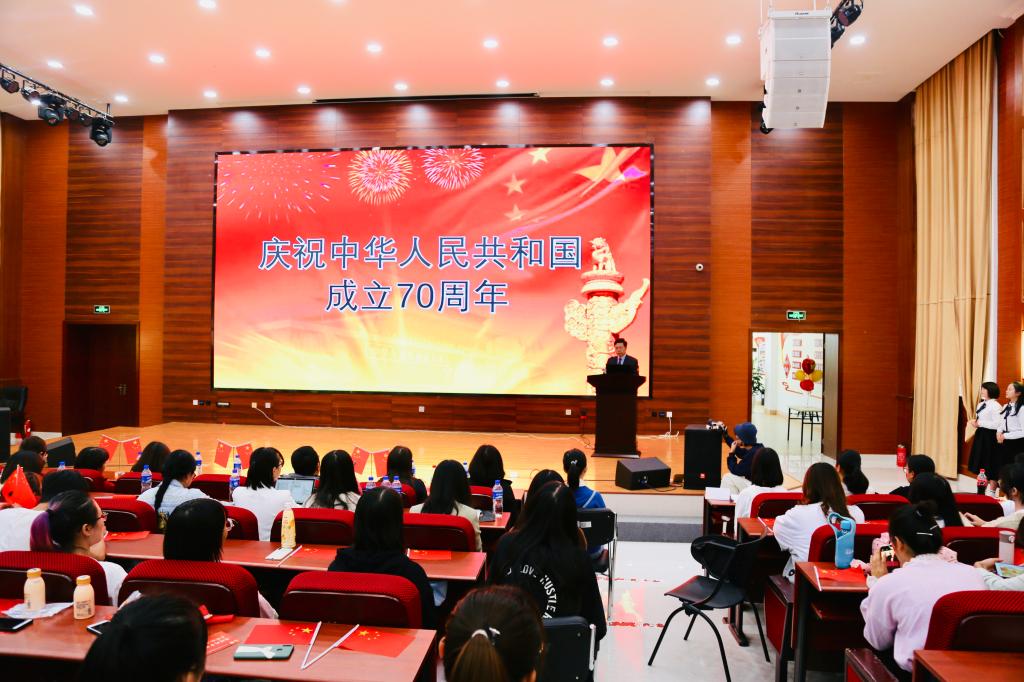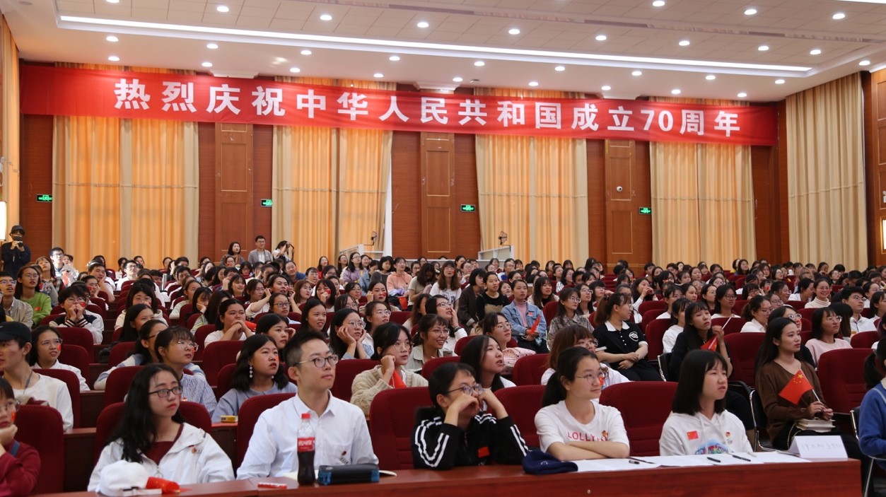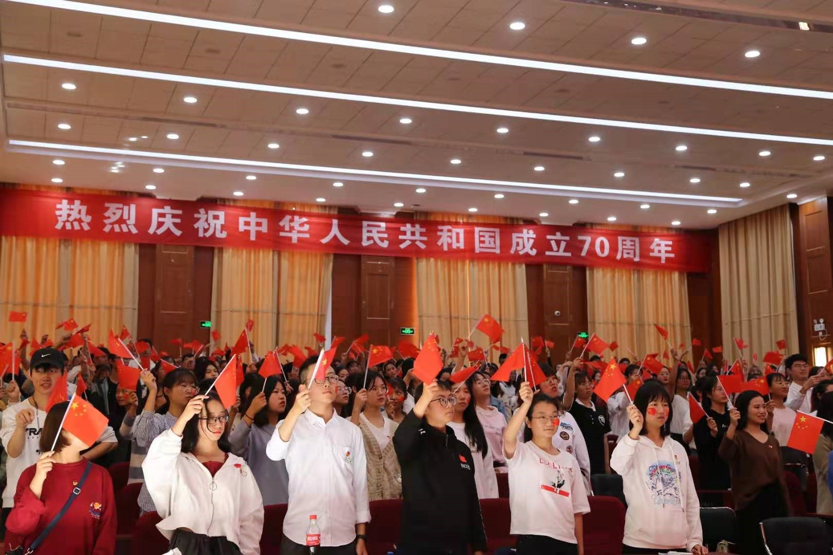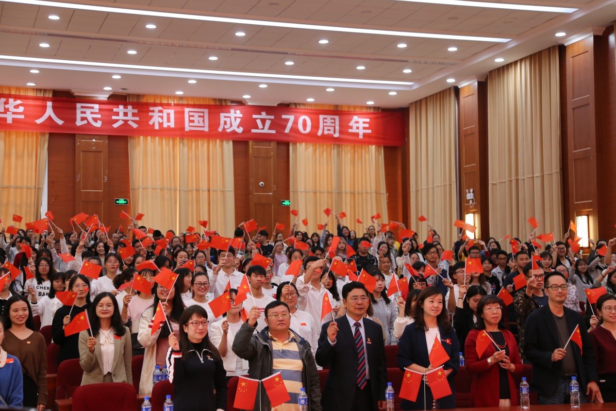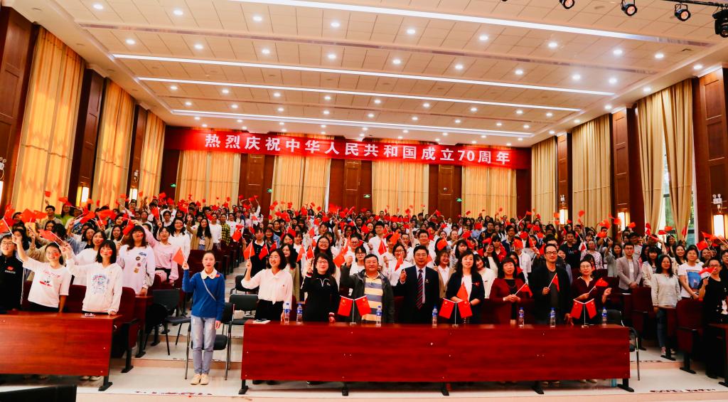 2019年10月1日上午,600cc全讯白菜自助注册组织了以“我和我的祖国”为主题的庆祝中华人民共和国成立70周年活动。在600cc全讯白菜自助注册报告厅学院党委领导、党委委员、支部书记、其他党务工作者和教师、学生代表近四百余人参加活动,全体师生热情洋溢,报告厅座无虚席。