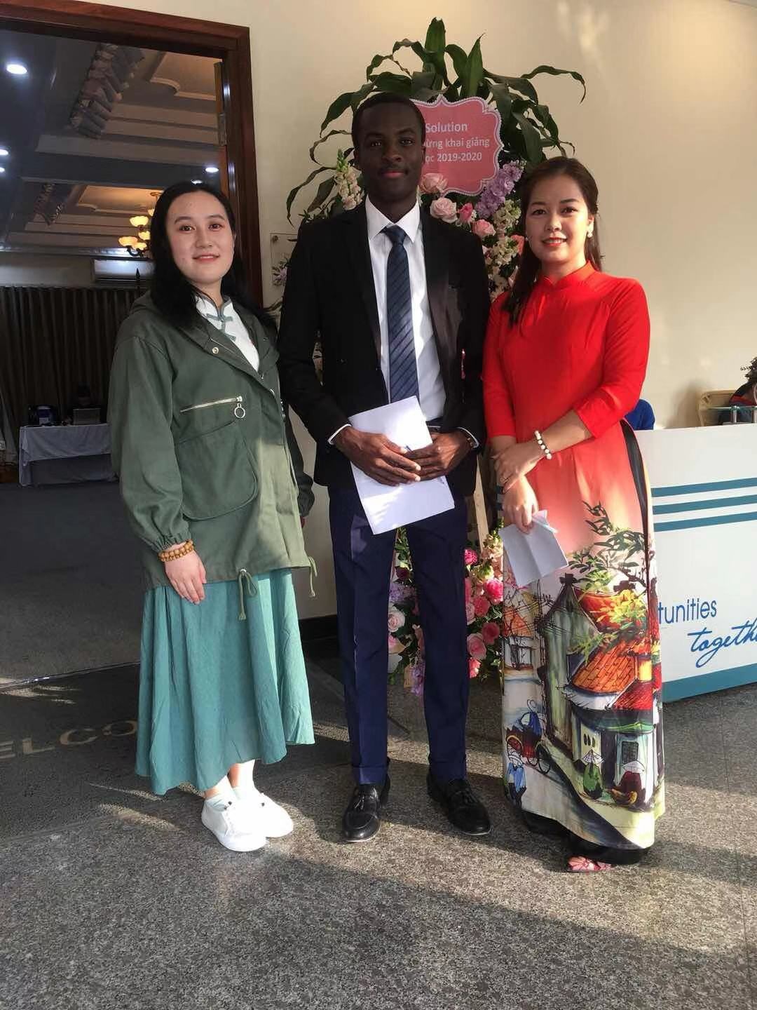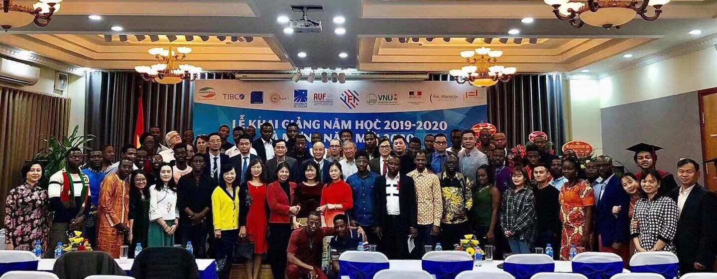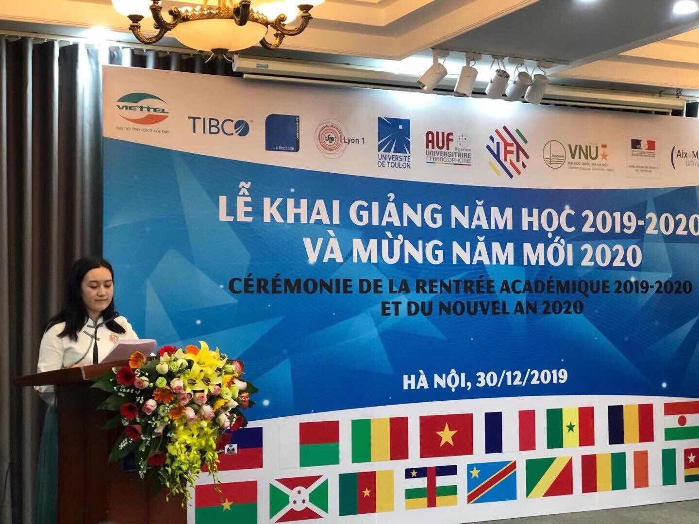 越南河内当地时间2019年12月30日下午15:30,“越南河内国家大学国际法语学院2019-2020学年开学典礼暨新年晚会”在越南河内国家大学的蔡冠深楼举行,杨佳圆同学作为“越南-法国合作项目”接收的第一位中国学生,代表所有新生致词。出席典礼的来宾有越南河内国家大学校长、国际法语学院院长、各法国合作伙伴大学代表、各越南政商学界人士代表、学院教师及学生等共一百多人。