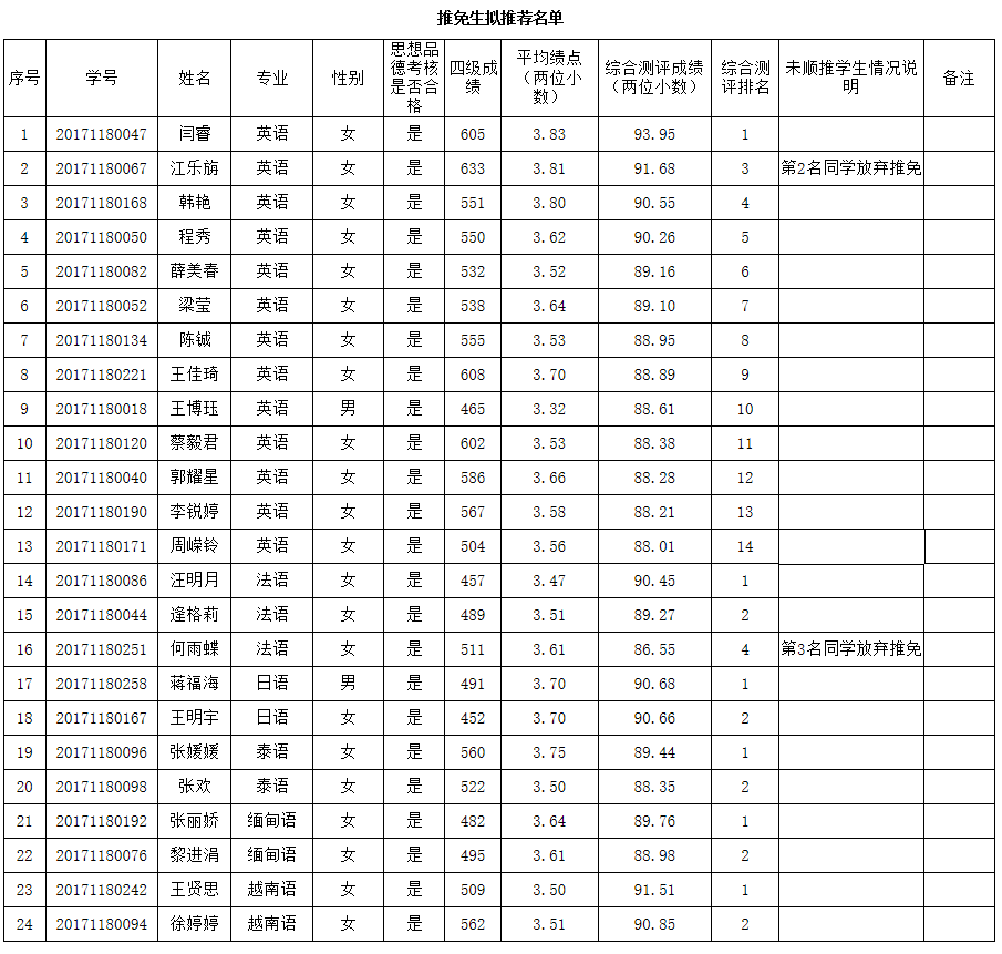 根据教育部《关于进一步规范和加强推荐优秀应届本科毕业生免试攻读研究生工作的通知》(教学厅[2020]12号)、《关于做好2021年推荐优秀应届本科毕业生免试攻读研究生工作的通知》(教学司函[2020]38号)精神,白菜官网按照《2023白菜网总站大全2021年推荐优秀应届本科毕业生免试攻读研究生工作管理办法》《2023白菜网总站大全600cc全讯白菜自助注册2021年推荐优秀应届本科毕业生免试攻读研究生工作方案》《600cc全讯白菜自助注册2021年推荐优秀应届本科毕业生免试攻读研究生补充细则》要求,在学生本人申请、民主推荐、公开评选的基础上,学院推免生遴选工作小组本着公开、公平、公正的原则,严格按推荐条件择优确定初选名单。现将白菜官网2021年免试攻读研究生拟推荐名单公示如下。如有异议,请于2020年9月30日以前到学院办公室反映,联系电话:65033632