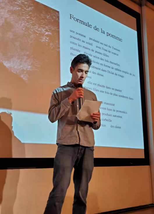 著名诗人于坚教授朗诵了自己的诗歌《被暗示的玫瑰》与《苹果的法则》,并由杜方绥朗读了于坚诗歌的法语译版。两位青年诗人红布条儿与陈秦少浮也朗读和分享了各自创作的诗歌。另外,大家共同鉴赏了四位来自不同国家地区的法语当代诗人特别为本次活动录制了诗歌朗诵视频。