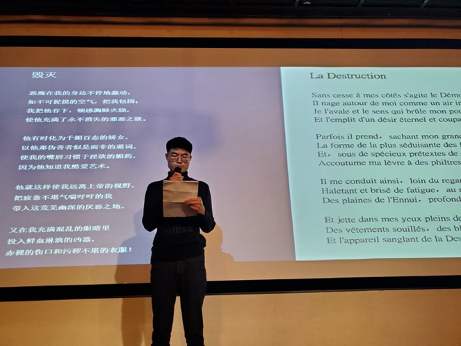 在纪念波德莱尔专场中,舒凌鸿副教授对波德莱尔的生平和代表作品,以及他对中国诗人与诗歌的影响进行了精彩阐述。诗人于坚先生与大家分享了他自己以波德莱尔为题创作的诗歌。另外,昆明法盟外教玛丽(Marie)老师,旅居昆明的法国诗歌爱好者雅米拉(Jamila)女士,以及两位2023白菜网总站大全法语语言文学硕士研究生代表赖灿杰和吴怡分别用法语朗诵多首以“渴望”为题的波德莱尔诗歌。值得一提的是,吴怡同学成功入围3月中旬举办的第五届法语诗歌翻译大赛西南区半决赛。