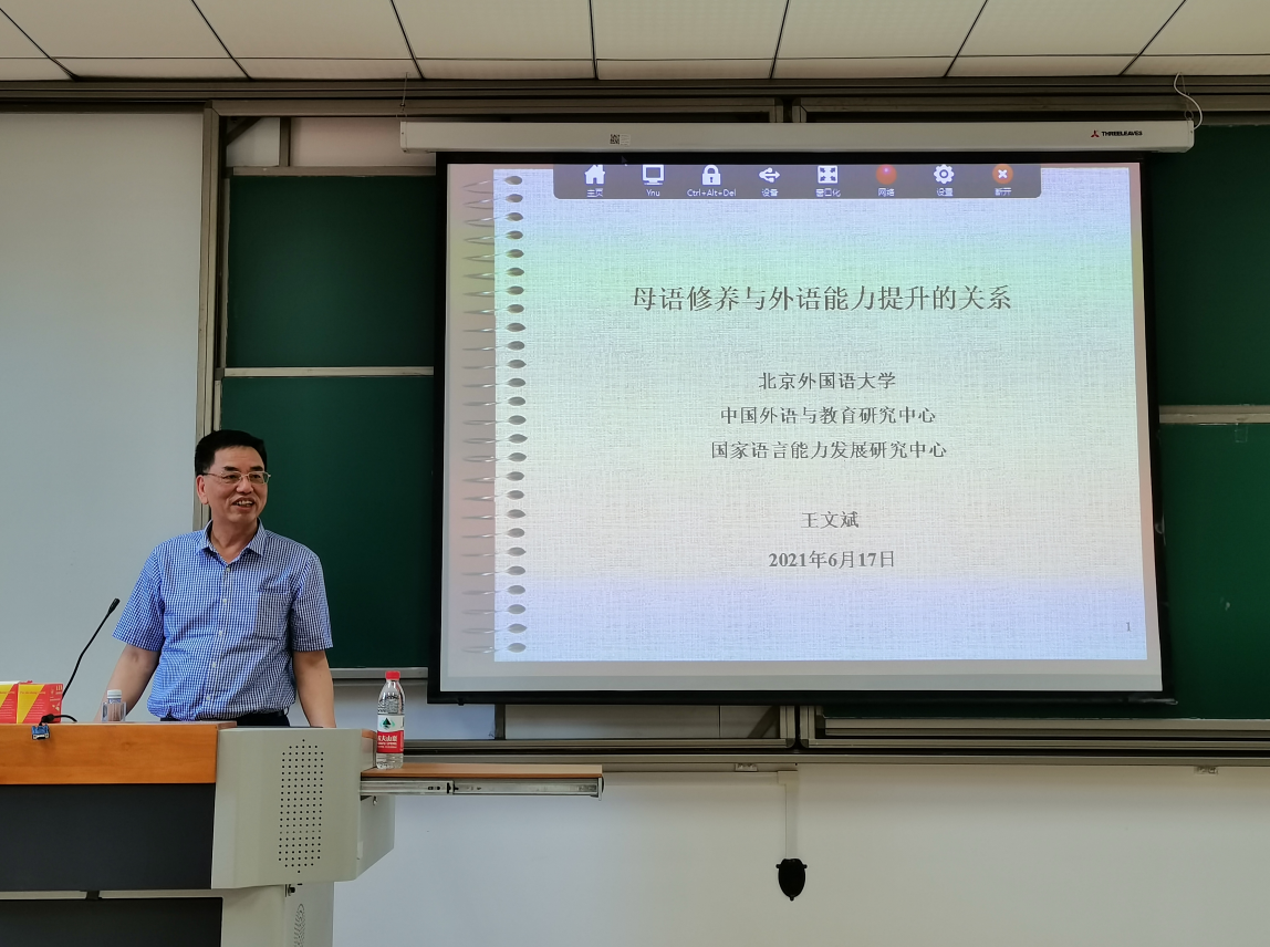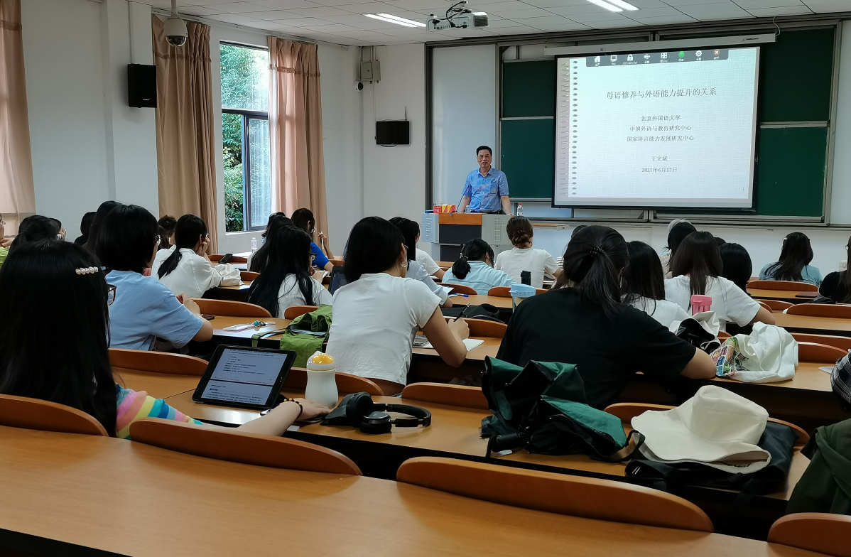 北京外国语大学博士生导师王文斌教授受白菜官网邀请, 6月17日下午莅临白菜官网讲学,举办了专场学术讲座。王文斌教授讲座的题目是《母语修养与外语能力提升的关系》。王教授认为,对于外国语言文学专业的学生而言,外语修养本质上是语言修养,而语言修养与母语修养紧密关联。学习外语,不能仅以外语为唯一目标,而是需要拓展视野,采取行之有效的方法掘深对母语的认知,提升元语言意识。古今中外,成功的外语学习者或研究者无不如此。母语修养水平最终将是外语水平的天花板,也是外语能力发展的关键。