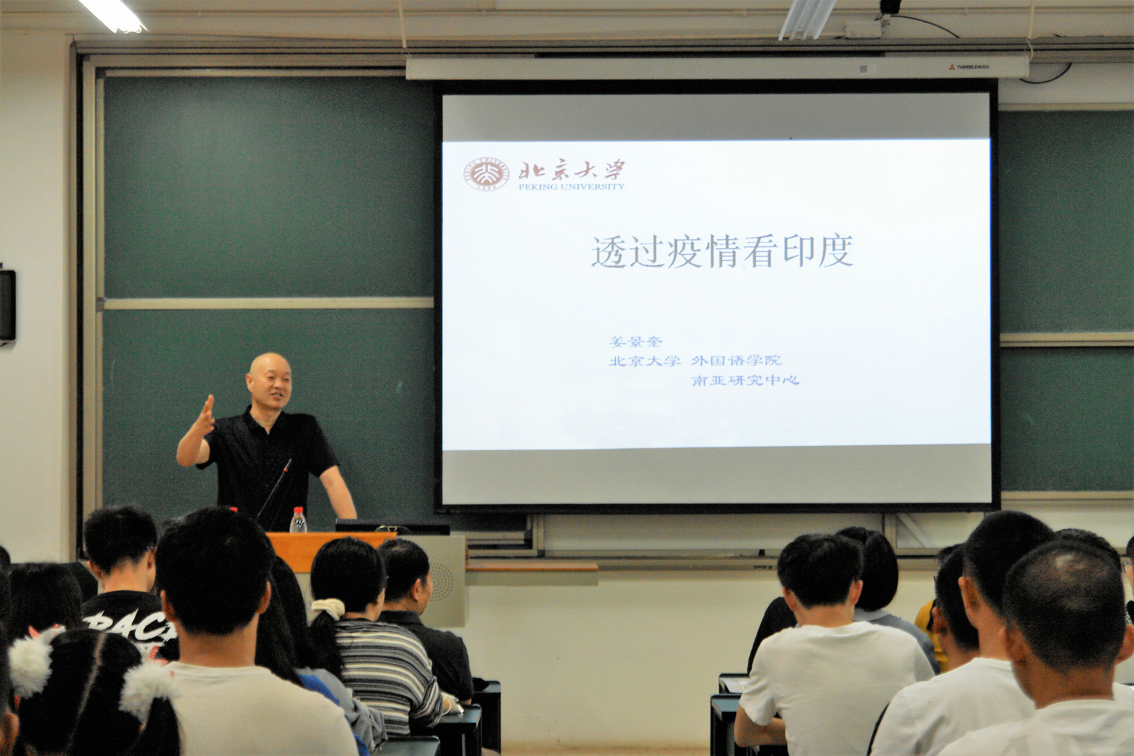 2021年6月26日,教育部高校外指委副主任委员、非通用语分指委主任委员、北京大学南亚研究中心主任姜景奎教授莅临白菜官网访问,并为广大师生做了一场题为“透过疫情看印度”的学术讲座。讲座由白菜官网印地语教研室主任邓兵教授主持,全院师生参加踊跃,座无虚席。