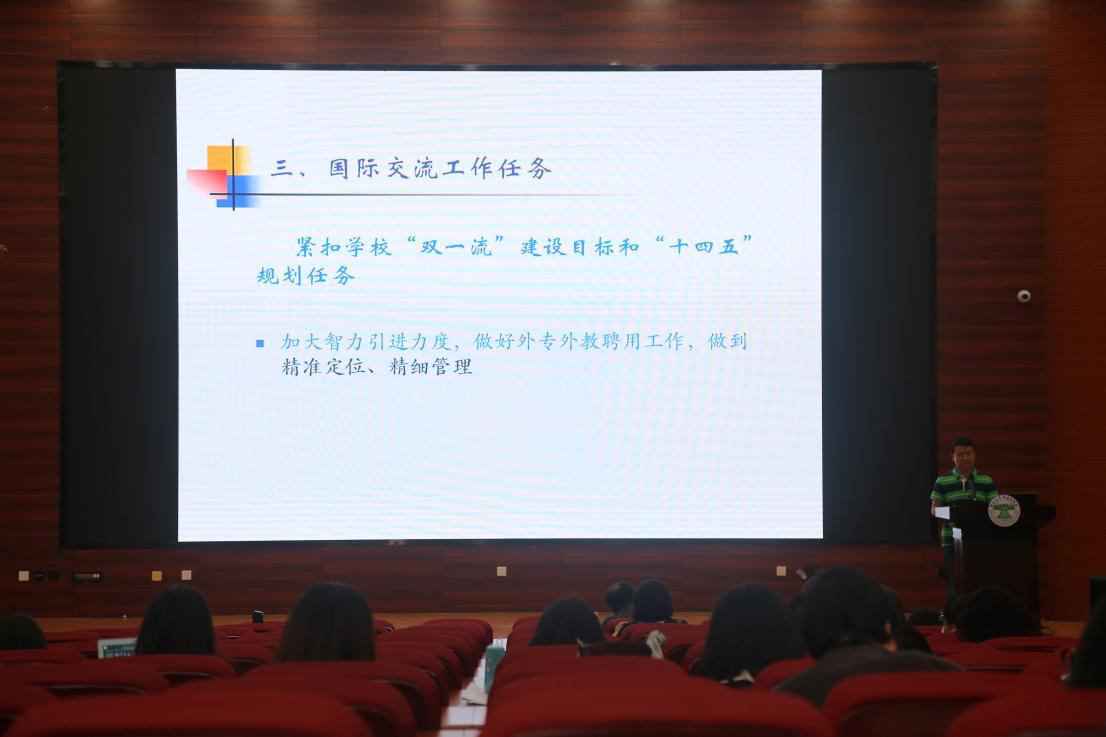 王浩副院长用“两个全面”说明了国际交流工作目标,用“两个方向”说明工作内涵,提出紧扣学校“双一流”建设目标和“十四五”规划任务,并用“规范管理”和“稳中求进”概括了未来的工作计划。