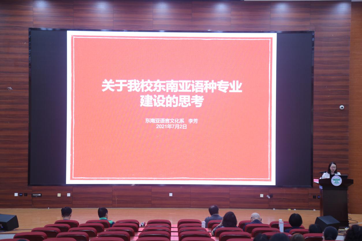 东南亚语言文化系主任李芳从东南亚语种专业群的开设历史与现状、外国语言文学学科内涵、东南亚语种专业定位等方面进行了介绍,并提出了新形势下东南亚语种专业的发展方向,提出了关于我校东南亚语种专业建设的思考。