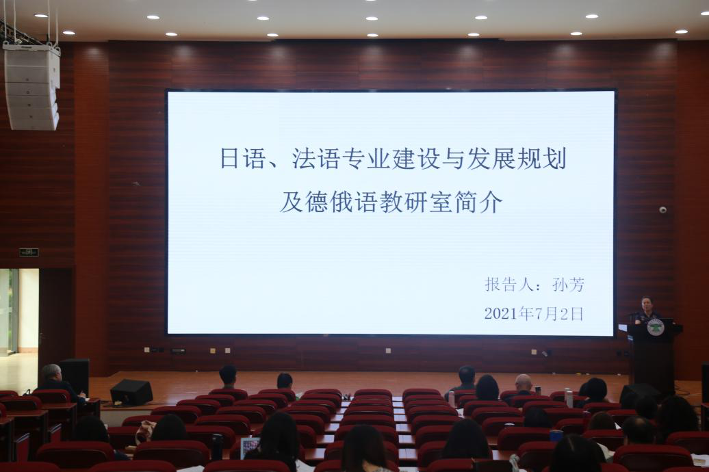 法语系主任孙芳从学科战略发展规划、成果总结、未来展望三个方面提出了日语语言文化专业以及法语专业的建设与发展规划,并从部门概况、成果概况以及未来展望三个方面对德俄语教研室进行了简介。