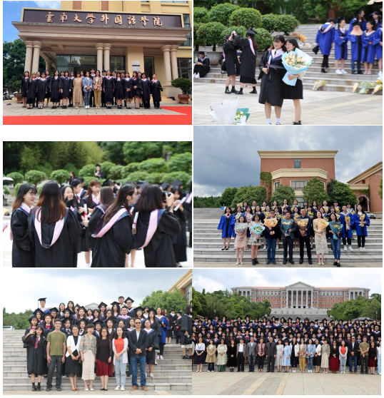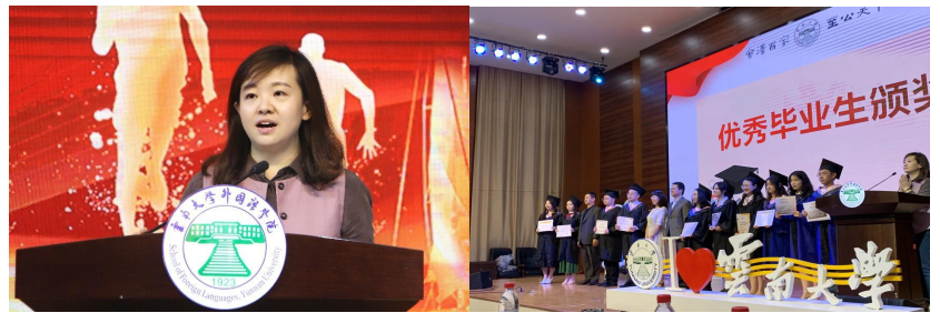 教师代表发言过后,由2018级英语专业本科生周子涵、2018级泰语专业本科生裘清源、2019级亚非语言文学专业硕士研究生孙国丽三位同学作为毕业生代表上台发言。三位同学回望了在云大学习的美好经历,分享了自己的所感、所思、所得,展望了毕业后的发展前景。在讲话的最后,优秀毕业生代表们祝愿同学们都能找准自己人生的罗盘,找寻、寻得、追逐自己的梦想,祝所有老师和同学们平安喜乐、前程似锦。