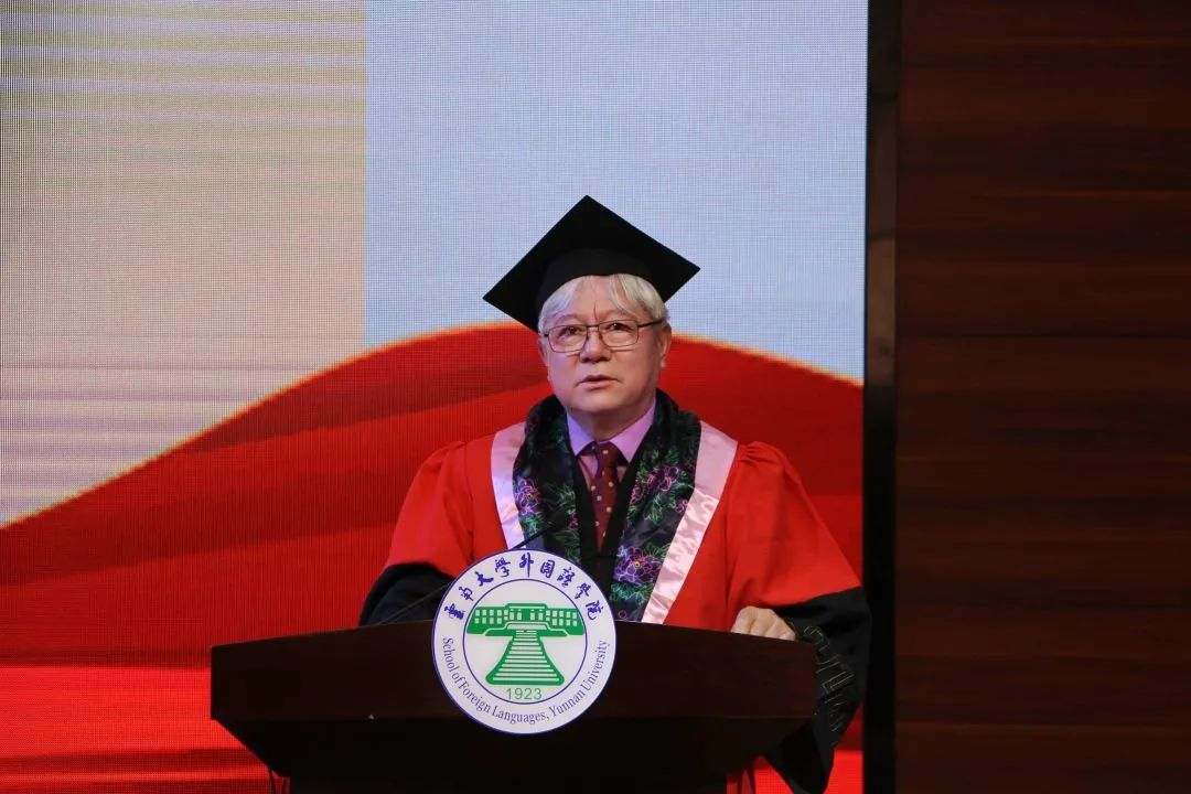 全院师生合唱国歌,毕业典礼正式开始。刘树森院长代表600cc全讯白菜自助注册全体师生对2022届毕业生圆满完成学业表达了最真诚的祝贺。刘院长表示,很欣慰地看到毕业典礼的召开,一届新的毕业生即将走出校园,为社会提供新鲜的血液。同时,为印地语专业的首届毕业生考研考取率达40%而感到骄傲,为外院今年各专业较高升学率感到自豪。刘院长接着解释了英语中“毕业”的单词“commencement”,它既是“毕业”,也是“开始”的意思,象征着毕业生们将辞别积淀满满的四年,开启一段新的征程。最后,刘院长以“我是云南的,云南云大的”这样一段改编自网络热梗的调子,点燃了现场的气氛,在场师生们纷纷献上了热烈掌声和欢呼声。