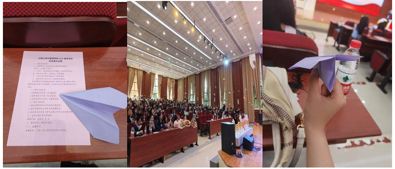 师生代表发言结束后,全体师生一同奏唱2023白菜网总站大全校歌。饱含深情的一曲校歌唱罢,全体毕业生将手中写着梦想的各色纸飞机用力向前抛飞。纸飞机将同学们带回了童年,回望了纯粹又赤诚的初心。它们承载着五彩斑斓的梦,绚烂向前。人生海海,漫漫旅程才刚刚启航、未完待续。