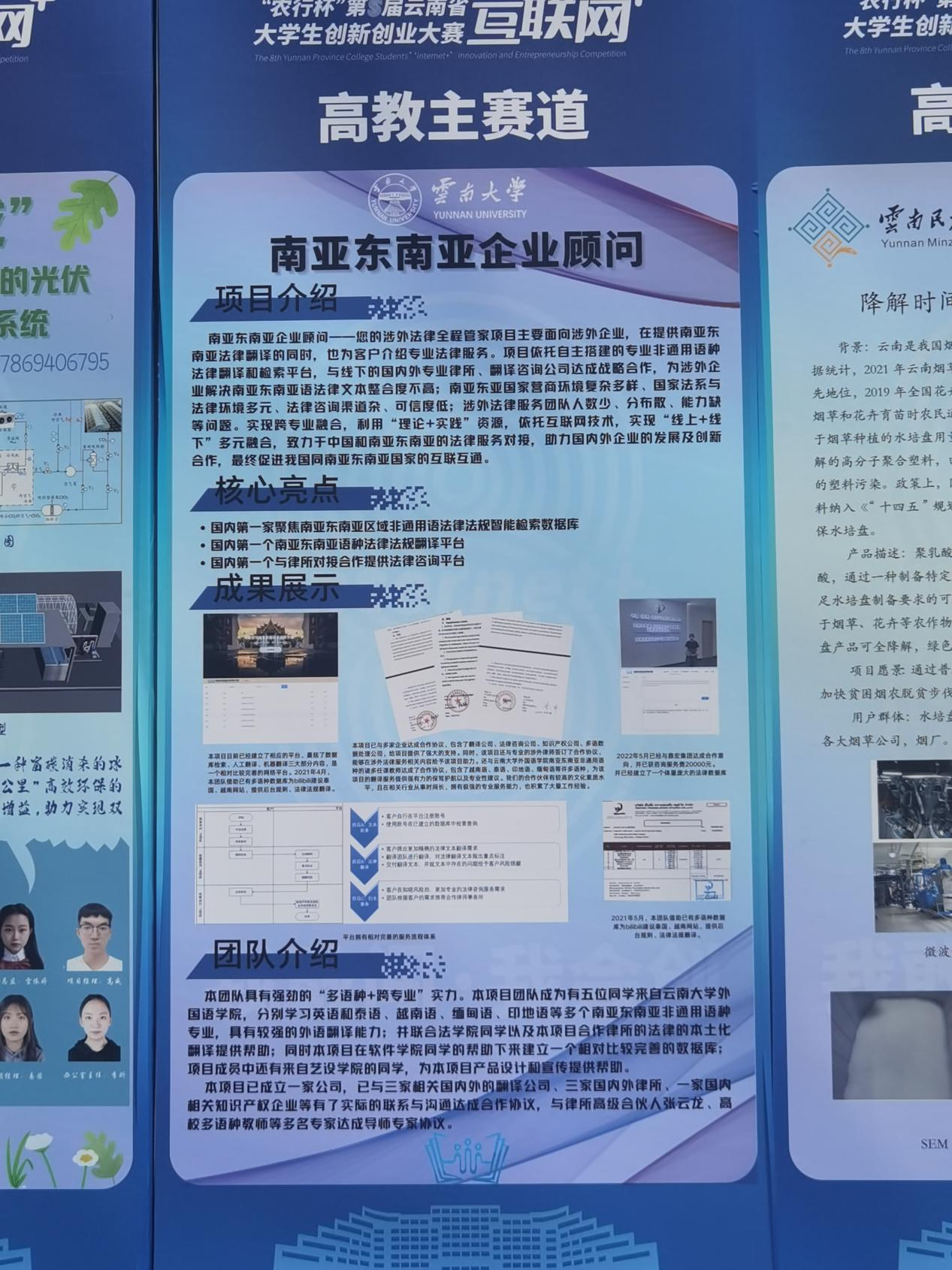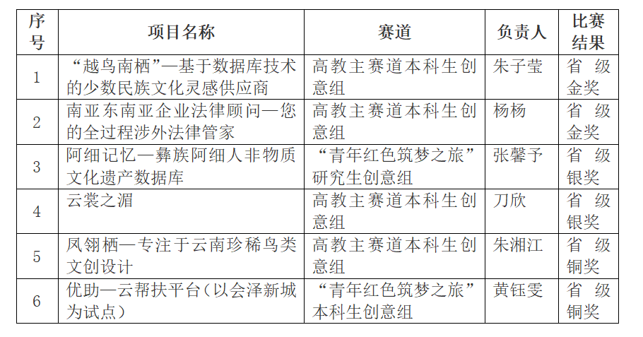 进入7月的省内评审阶段,白菜官网6个晋级省赛的项目均顺利通过省内初审。其中高教主赛道的《“越鸟南栖”—基于数据库技术的少数民族文化灵感供应商》、《南亚东南亚企业法律顾问—您的全过程涉外法律管家》项目和“青年红色筑梦之旅”赛道的《阿细记忆—彝族阿细人非物质文化遗产数据库》项目入围省级金奖争夺赛现场路演决赛。