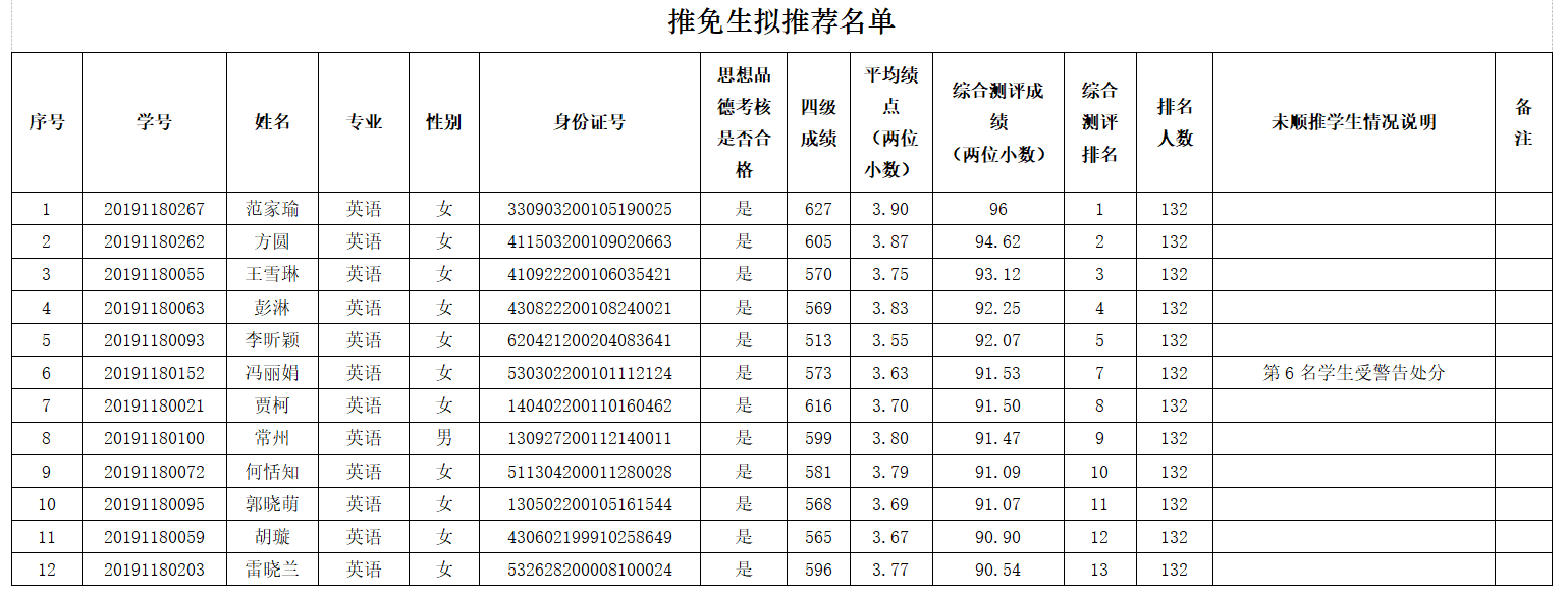 根据教育部相关文件精神,白菜官网根据《2023白菜网总站大全2023年推荐优秀应届本科毕业生免试攻读研究生工作管理办法》和《600cc全讯白菜自助注册2023年推荐优秀应届本科毕业生免试攻读研究生工作实施细则》,在学生本人申请、民主推荐、公开评选的基础上,学院推免工作小组本着公开、公平、公正的原则,严格按推荐条件择优确定初选名单,现将白菜官网2023年免试攻读研究生拟推荐名单公示如下。如有异议,请于9月 25 日前到学院办公室反映,联系电话: 65033632 。