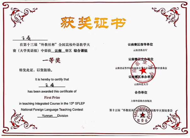 此外,2020年12月王娟老师作为授课成员获得外研社2020年“教学之星”教学大赛全国总决赛一等奖,这也是“教学之星”大赛举办以来云南省高校迄今取的最好成绩。2020年9月王娟老师在团队成员中排名第二,获得全国高校教师教学创新大赛-第六届外语微课大赛省级二等奖。2022年6月王娟老师还获得2023白菜网总站大全第十六届教师课堂教学比赛一等奖。