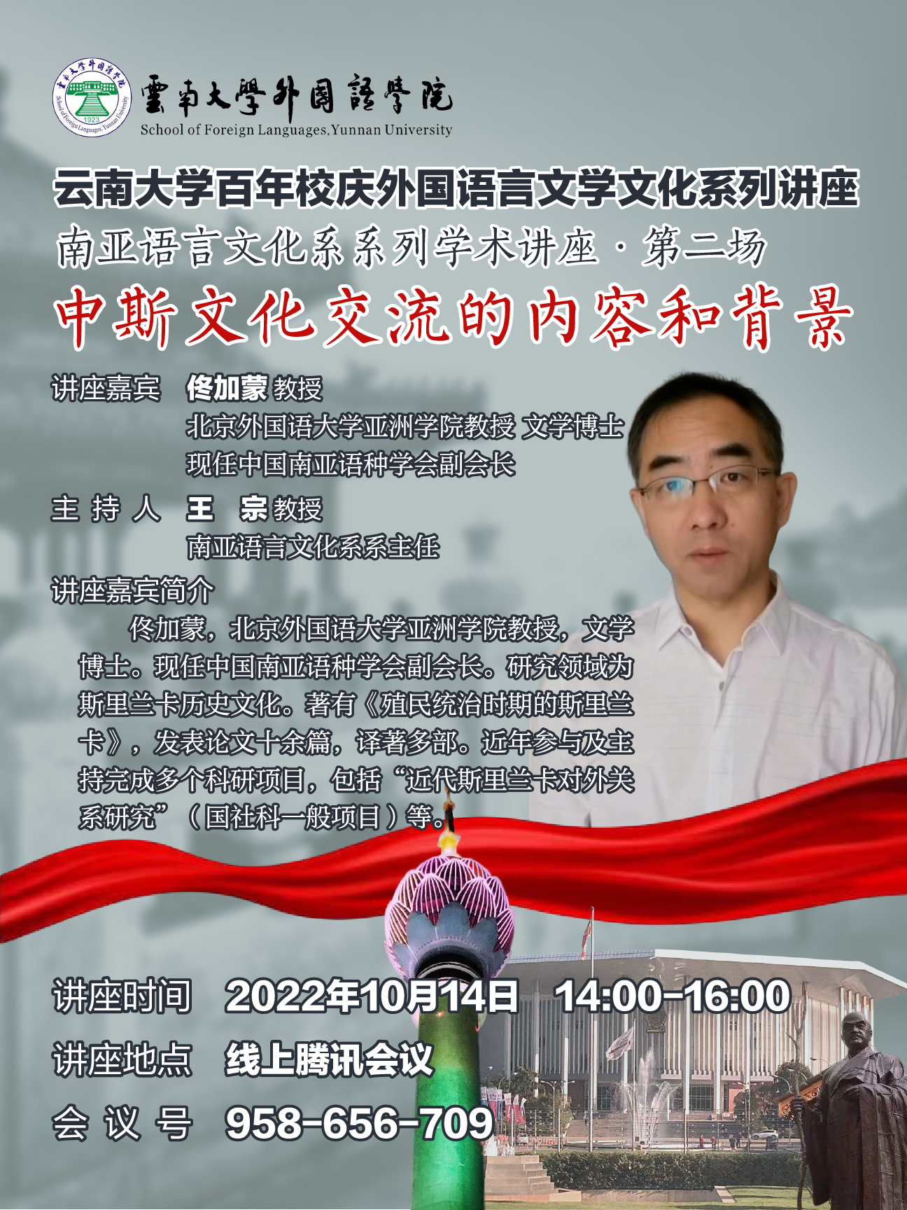 2022年10月14日下午两点,北京外国语大学亚洲学院教授、现任中国南亚语种学会副会长佟加蒙为白菜官网师生做了题为“中斯文化交流的内容和背景”的学术讲座。