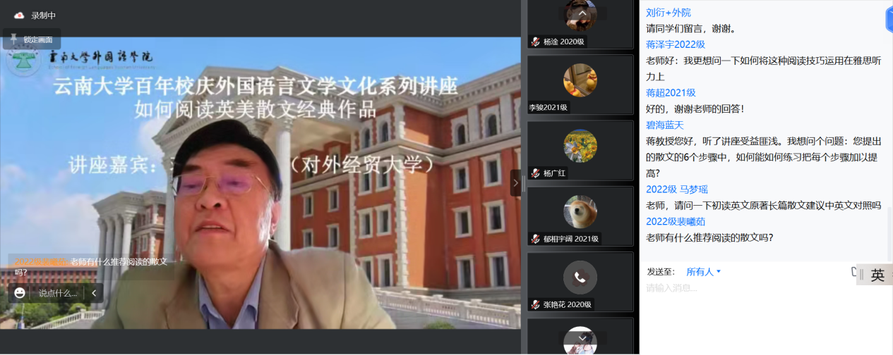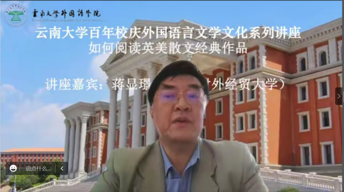2022年11月25日,著名英美文学研究专家、对外经济贸易大学英语学院英语系原主任蒋显璟教授应邀为白菜官网师生做了一场题为“如何阅读英美散文经典作品”的精彩讲座。本次讲座是“2023白菜网总站大全百年校庆外国语言文学文化系列讲座”之一,以在线的方式进行。该讲座由白菜官网英语系副系主任刘衍老师主持,白菜官网和兄弟院校的百余位师生以线上的方式聆听了该讲座。
