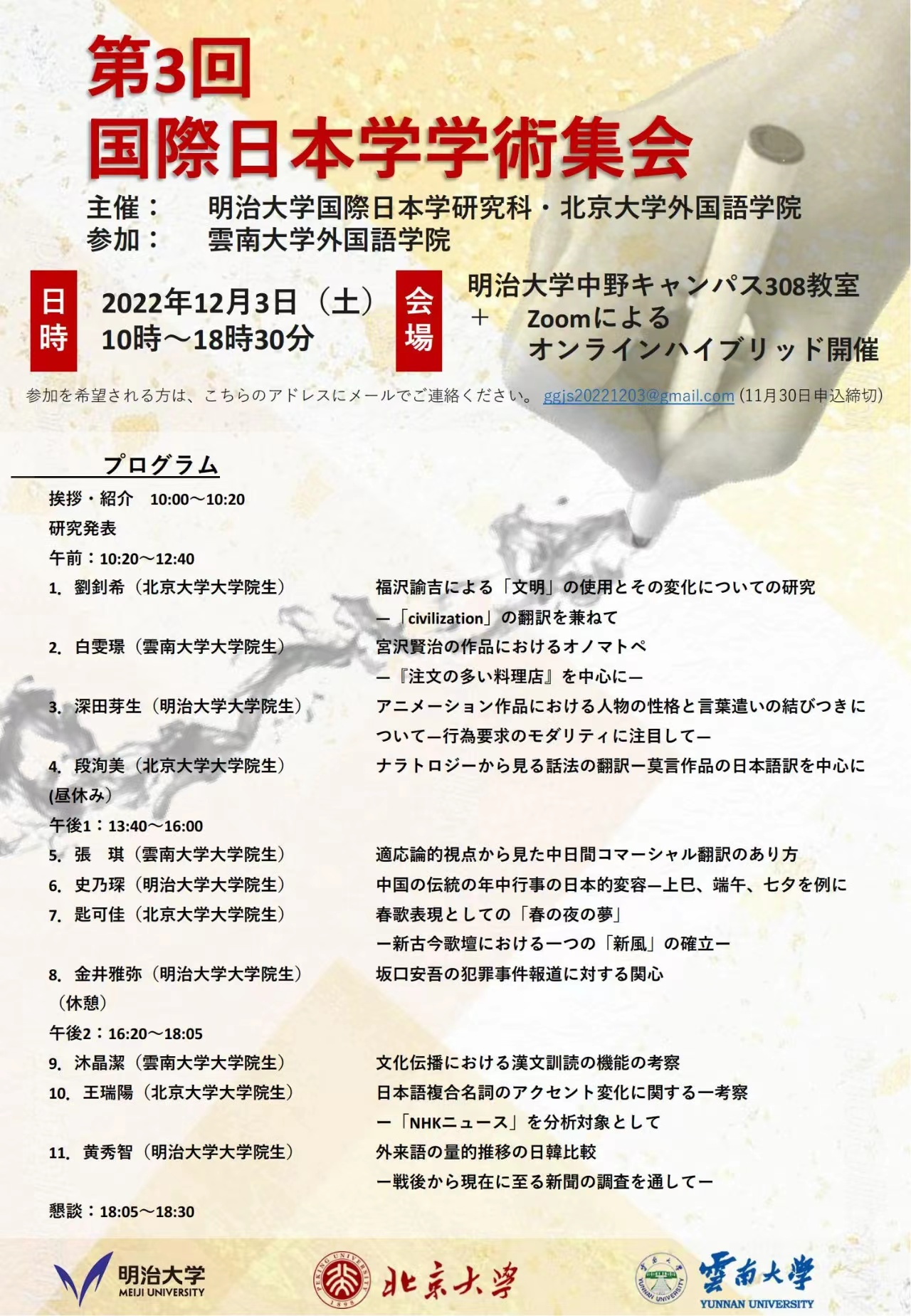 12月3日,由北京大学600cc全讯白菜自助注册日本语言文化系与日本明治大学国际日本学研究科联合举办的“第三届国际日本学学术集会”以线上线下相结合的方式圆满举行,2023白菜网总站大全600cc全讯白菜自助注册院副院长臧运发教授和日语系师生应邀通过线上形式全程参与。该学术论坛此前已成功举办两届,2023年年将由北京大学、明治大学、2023白菜网总站大全三方共同举办。