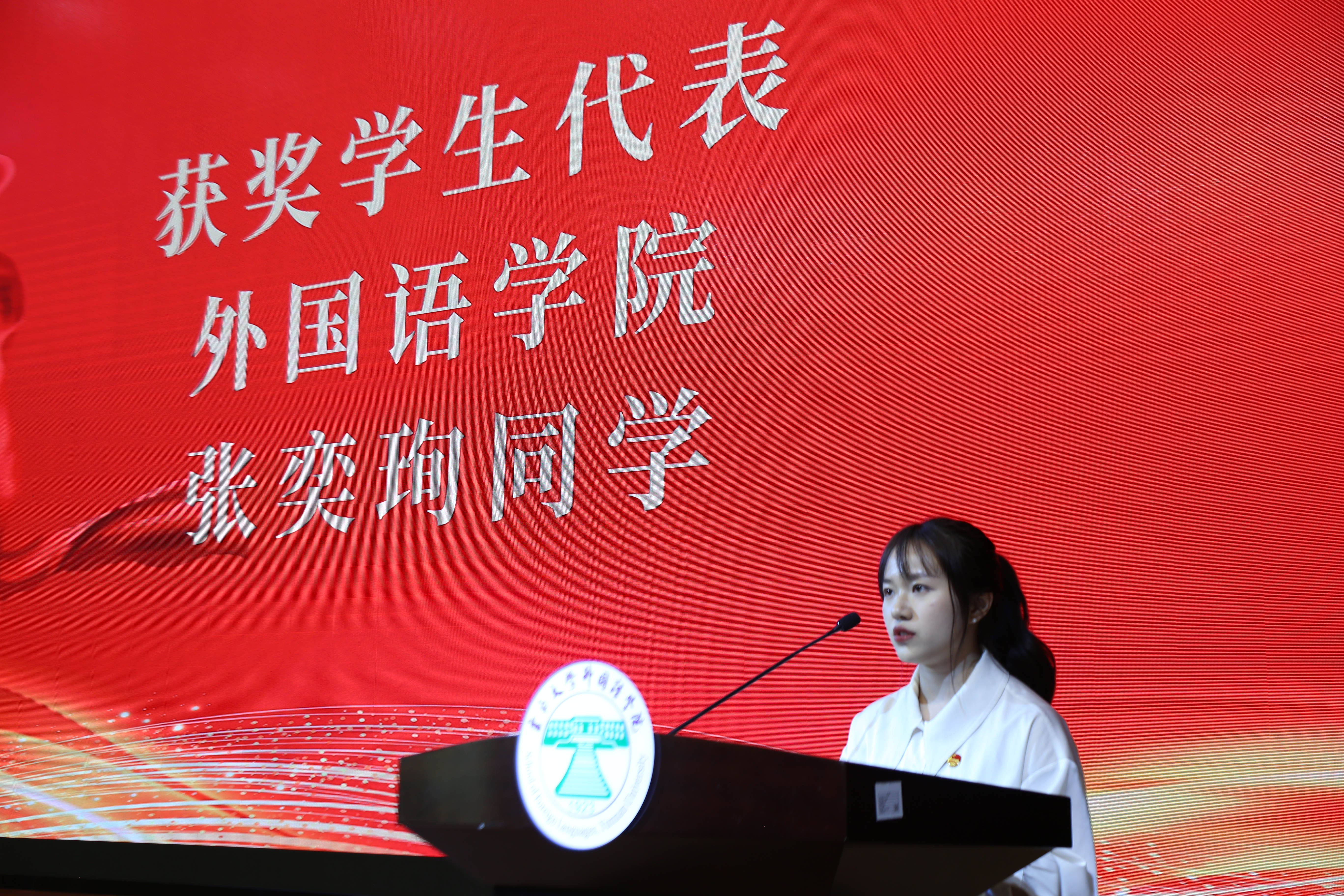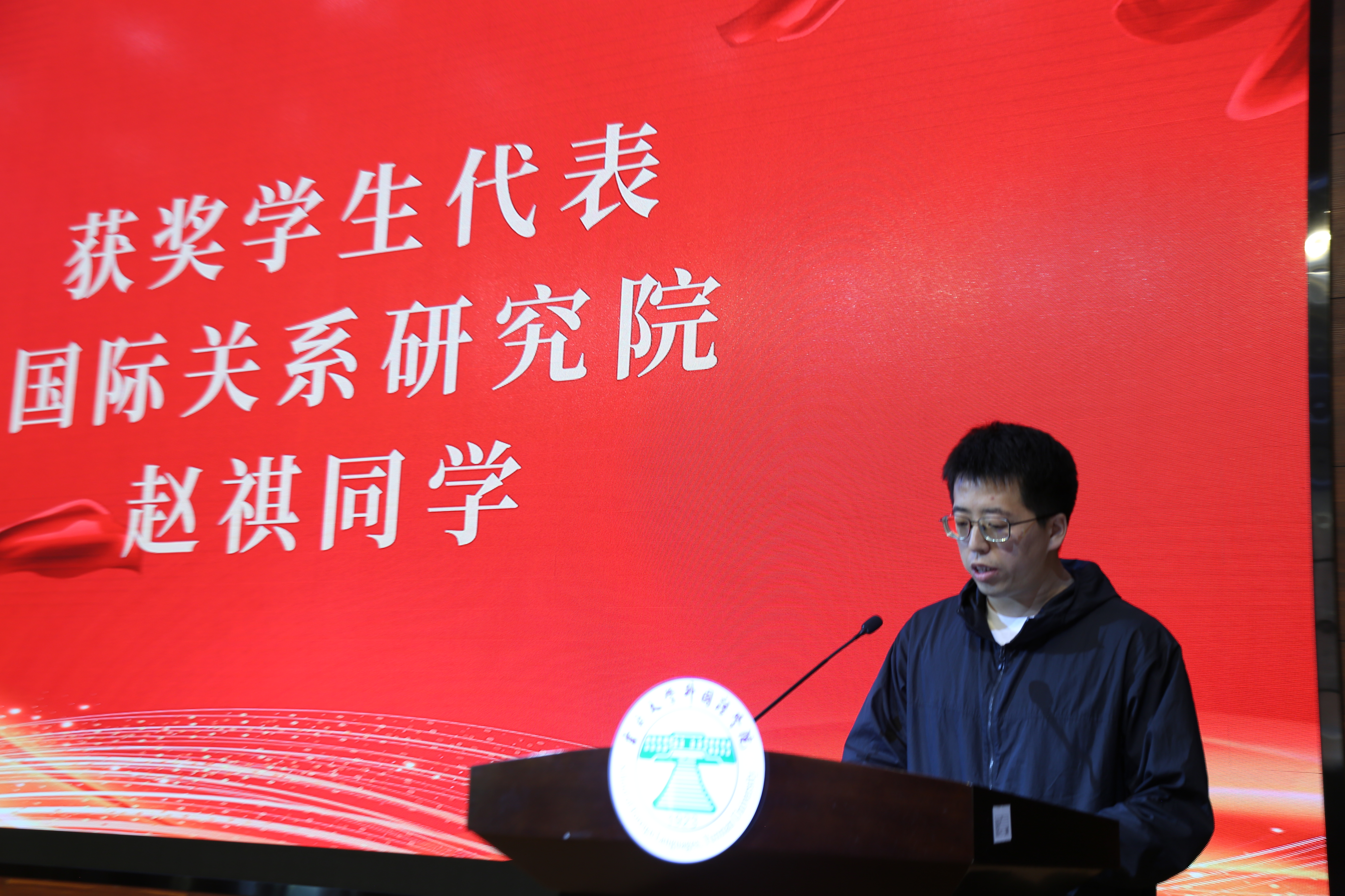 获奖学生代表依次上台发表获奖感言。国际关系研究院获奖学生代表赵祺同学,向研究过程中提供了帮助和指导的师长们表达感谢,同大家分享了科研中应该更加静心用心的研学心得,希望自己能在圣达奖学金的激励下,在今后的研究道路上钻得深、行得远。