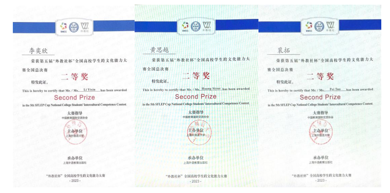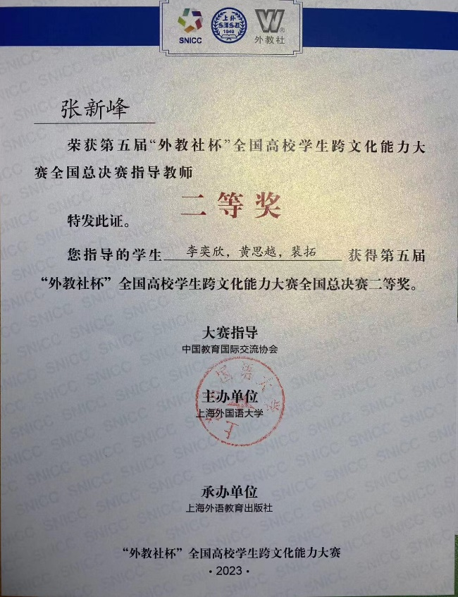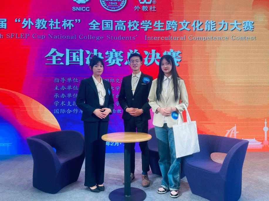 2月24日至26日,由上海外国语大学主办的第五届“外教社杯”全国高校学生跨文化能力大赛全国总决赛在上海举行。40支中国学生队伍和4支国际学生队伍历经校赛和省赛选拔脱颖而出,在全国决赛的舞台上同台竞技、大放异彩。白菜官网本科生黄思越(2019级英语专业)、李奕欣(2020级英语专业)、裴拓(2021级法语专业)三位同学在张新峰老师的指导下取得了全国决赛二等奖的好成绩。