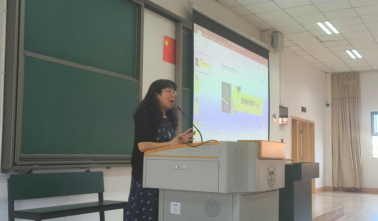 接下来,由教学办主任任志睿老师发言。任老师为大家详细地讲解了大学学习中的教务相关事项,分别从学校作息表、专业人才培养方案、教学教务管理系统及其他注意事项四个方面展开讲述。关于学校作息表,任老师提醒同学们要按时上课,并介绍了本学期教学周和考试周的相关安排。随后,任老师又分别从通识教育,学科教育,专业教育,拓展教育四部分向同学们介绍了专业人才培养方案,详细地讲解了大学课程的组成及选课的相关规定,让同学们对大学课程的学习有了更加清晰的认知。接着,任老师给大家详细介绍了教育相关的管理规定,其中包括由于辅修,重修,转专业导致的课程冲突问题以及申请缓考等,让同学们意识到大学学习的管理之严格。其他注意事项中,任老师细心地找出并着重地强调了一些容易因操作错误而造成个人损失的地方。任老师的严格而又细致的讲解,不仅让同学们体会到大学学习规定之严格,也让大家更加重视起大学的学习,在学习之路上更加踔厉奋发!
