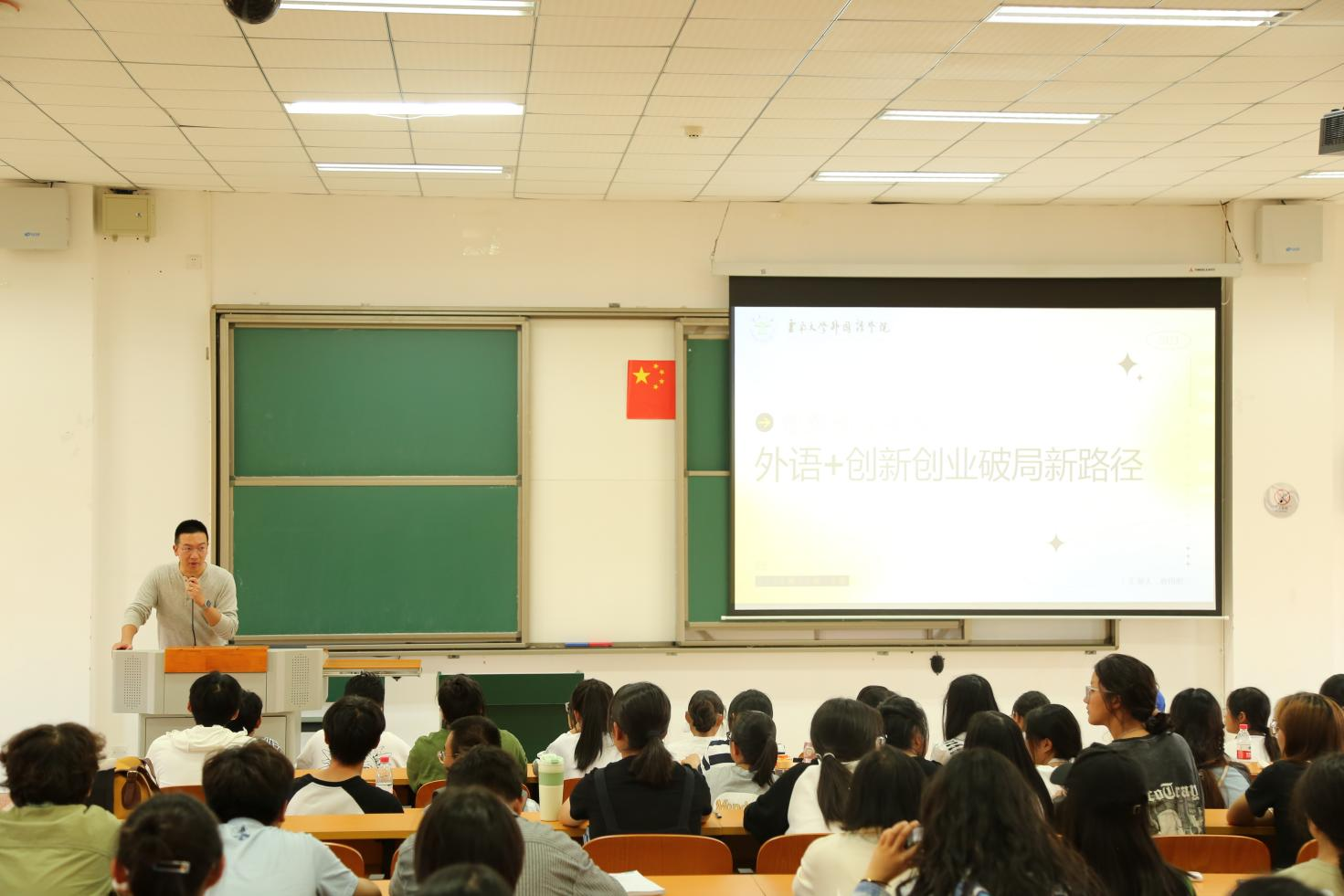 2023年9月22日16时,600cc全讯白菜自助注册2023级本科新生开学第一课在文汇楼2418圆满举行,600cc全讯白菜自助注册创新创业负责人唐国淞老师出席本次活动,并以“外语+创新创业突破新路径”为主题对创新创业项目进行了介绍,帮助了同学们树立创新创业观念,积极主动参与到创新创业活动中锻炼自我,提高竞争力。