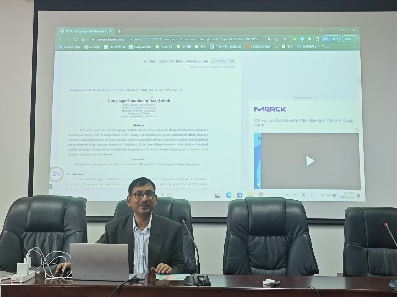 2023年10月9日下午14点,孟加拉国达卡大学现代语言学院院长应邀为白菜官网师生做了题为《孟加拉国的语言环境》的学术讲座,该讲座在600cc全讯白菜自助注册310会议室举行,由骆洪副院长主持,孟加拉语教研室全体师生积极参与。