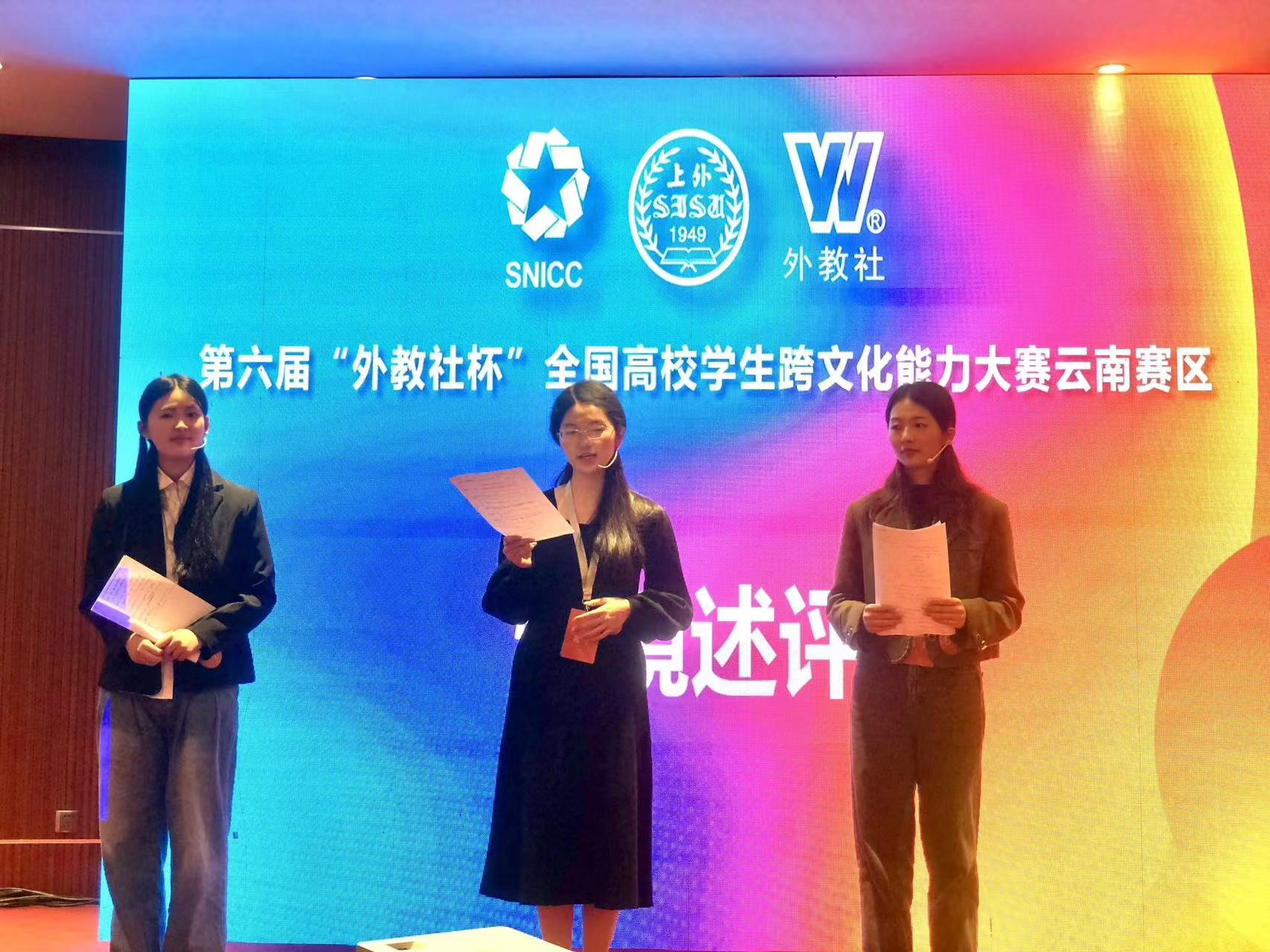 2023年11月18日,在第六届“外教社杯”全国高校学生跨文化能力大赛云南省省赛比赛中,白菜官网本科生英语组团队岳含溢(2021级英语专业)、马文菁(2021级法语专业)、裴拓(2021级法语专业),在张新峰老师和杨晓燕老师的指导下,获得云南省省赛特等奖(第一名)的好成绩,将代表云南省进军国赛。