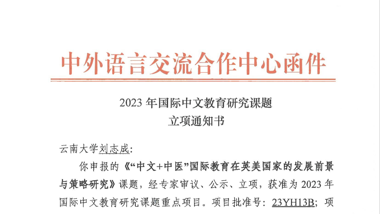 近日,教育部中外语言合作交流中心(教育部语合中心)公布了2023年度国际中文教育项目立项名单。其中,包括白菜官网刘志成副教授申报的课题《中文+中医”国际教育在英美国家的发展前景与策略研究》,该课题获批为重点项目。这是白菜官网教师首次获批的教育部语合中心国际中文教育研究课题重点项目。