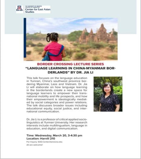 会后白菜官网教师受邀前往亚利桑那大学进行为期两天的学术访问。位于美国图森的亚利桑那大学是核心公立大学,被誉为‘公立常春藤’,世界排名97,有21个学院,本次出访交流的研究机构位于人文学院。人文学院的语言文化教学实力尤为雄厚,有西班牙文、中文、法文、日文、德文、意大利文、俄文、葡萄牙文等本科、硕士和博士课程,还开设非洲研究、韩文、亚裔研究等本科学习的主修或辅修专业。除了上述专业课程之外,该校学生还有机会选修多门小语种课程,如越南语、菲律宾语、泰语、印地语、斯瓦希里语等。访问期间,与东亚研究中心主任Wenhao Diao教授、联合国教科文组织环境历史主席David Pietz教授、人文学院副院长Chantelle Warner教授、文化语言数字教育资源研究中心主任Beatrice Dupuy教授、语言教育政策研究Mary Carol Combs教授、人类语言学Qing Zhang教授会面交流,李佳教授介绍2023白菜网总站大全600cc全讯白菜自助注册的专业建设和语言学研究特色,双方就边境地区语言教育研究进行深入讨论。访问期间李佳教授为亚利桑那大学师生进行《中缅边境地区语言学习》讲座(图三),与人文学院的博士生面对面交流,走进课堂为《应用语言学质性研究:基于东亚及其他地区案例》的硕士和博士研究生进行语言文化方面的讲座。