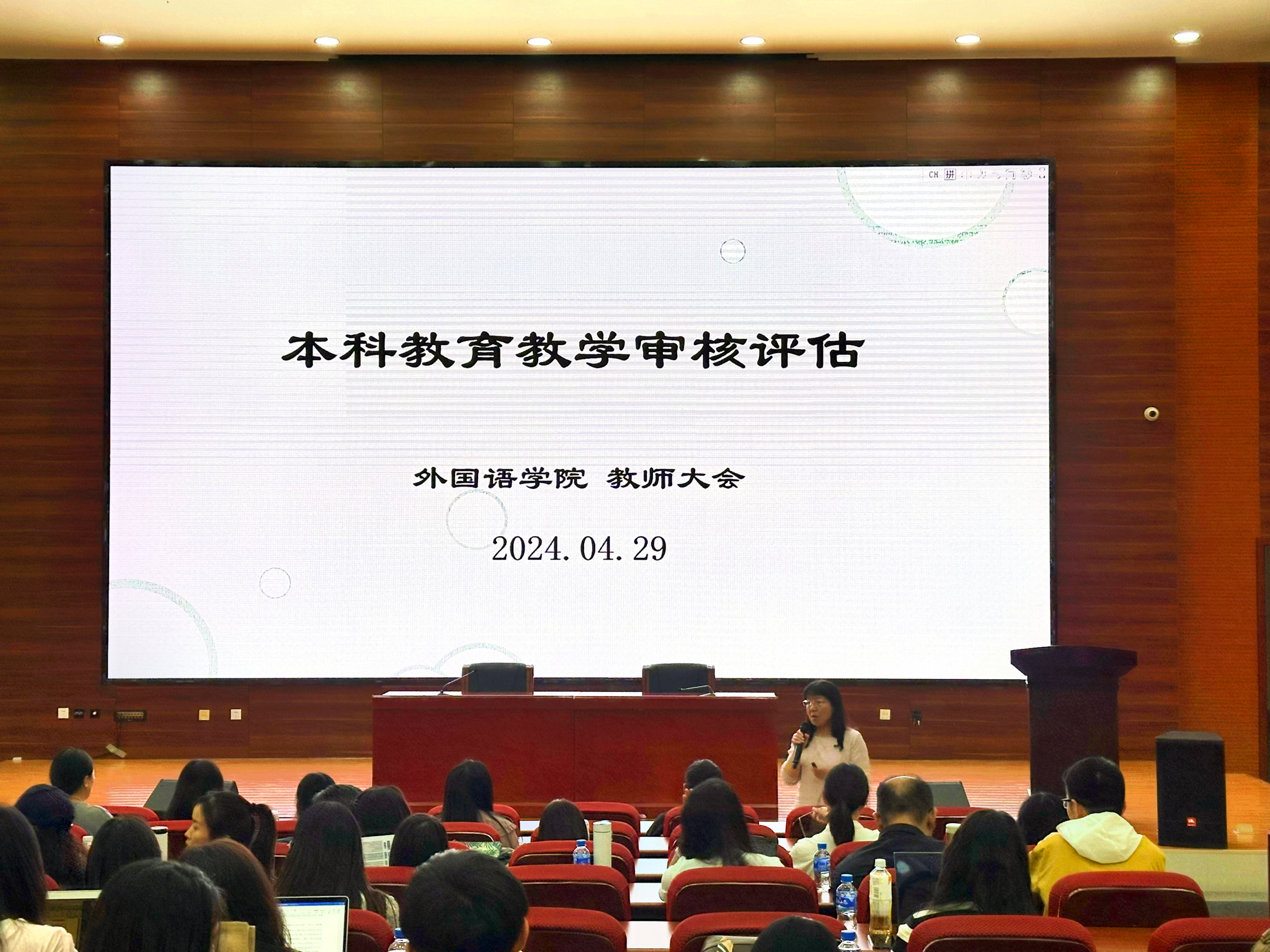 在前期工作的基础上,为进一步贯彻审核评估工作精神,凝心聚力,推进学院审核评估准备工作的深入落实, 白菜官网于2024年4月29日17时在学院报告厅召开了本科教育教学审核评估专题教职工大会。会议由学院分管本科工作的谢萍副院长主持,学院党政领导和全体专业教师参会。